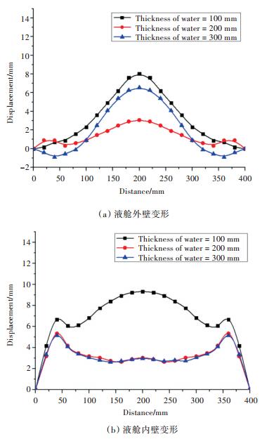 In order to study the energy absorption of different parts of a liquid cabin under a close-range explosion, a fluid-structure coupling model is built on the basis of experiments, and the deformation of the bulkhead and energy absorption ratio of different parts of the liquid cabin are analyzed, in which the influence of the water, bulkhead thickness ratio and water thickness are also discussed. The results show that the existence of a liquid medium can change the energy absorption model of a cabin. The total energy absorption is mainly affected by the front bulkhead thickness and water thickness, and alterations to the bulkhead thickness ratio or water thickness can also affect the deformation model of the bulkhead and energy absorption ratio of different parts of the cabin. A logical explanation of the energy absorption mechanisms of the liquid cabin is proposed, and some useful suggestions for designs are given.